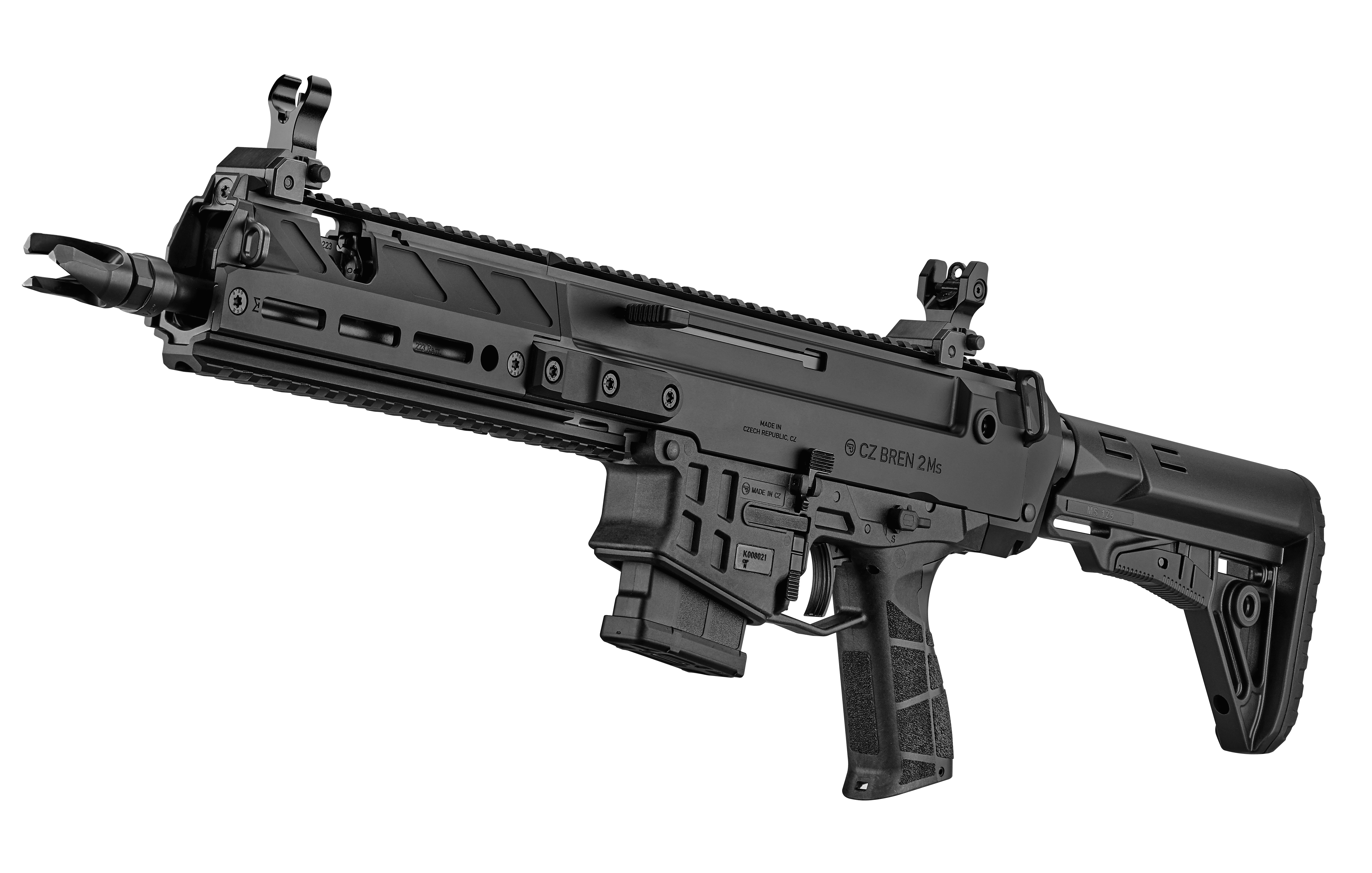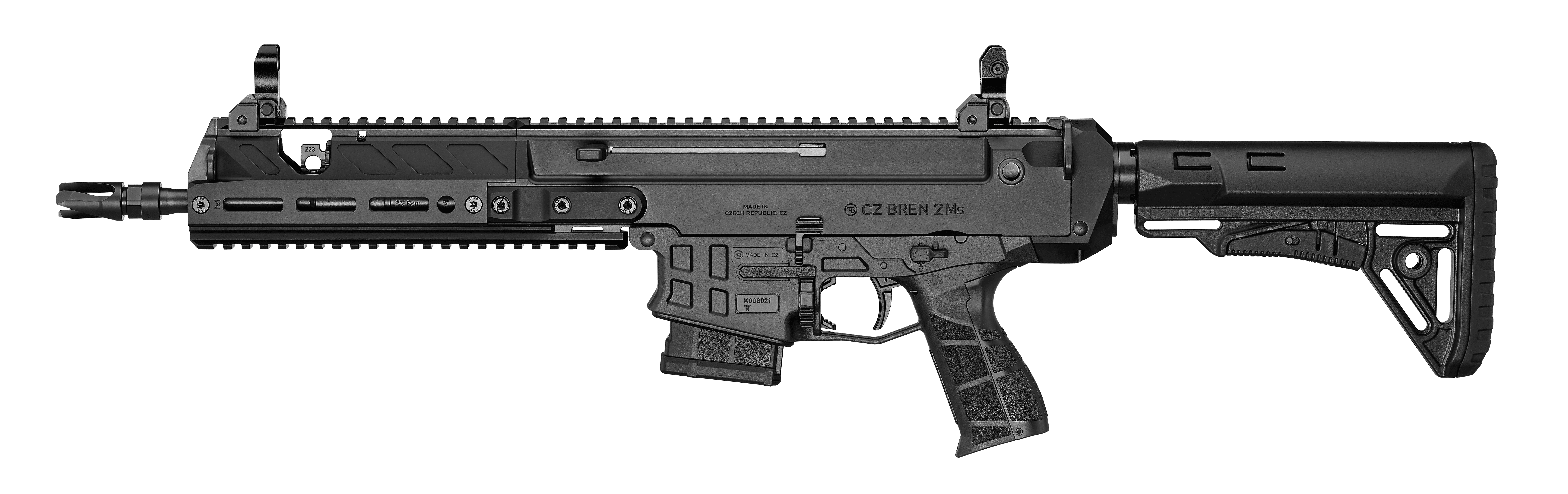 Receiver made from lightweight 7075 aircraft-grade aluminum alloyThe CZ BREN 2 Ms semi-automatic carbine is chambered in the popular 223 Rem. caliber. It comes with a long, interchangeable forend, 425 mm barrel, and extended folding/telescopic shoulder stock with raised comb. Its design is optimized for accurate shooting, even at longer distances. Standard equipment includes mechanical sights.